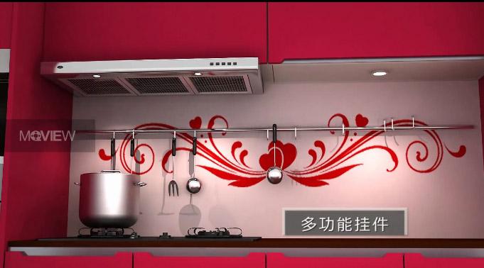 随着片子的节奏,我们会看到内嵌式抽油烟机的在整体设计上的亮点;多功能挂件带给我们的便利;电动伺服系统带给我们的轻松;开放式酒柜带给我们的惊喜;多功能岛台带给我们的想象;我们还会在三维构建的虚拟动态里,看到橱柜滑轨的运动过程,而不得不感慨科技改造生活,同样我们还会看到橱柜在细节设计上的用心,精致到让我们难以抗拒,